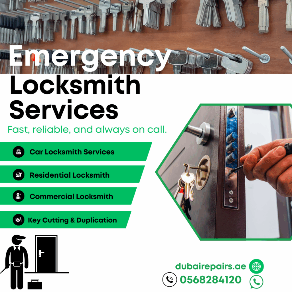 Dubai Repairs provides residential, automotive, and commercial clients with complete emergency locksmith solutions. Using non-destructive lock-picking techniques, our technicians can unlock most standard lock types in minutes. We also perform key cutting and replacement on-site using advanced key-cutting equipment for all major brands. When you replace lost or stolen keys, we can re-key or change lock cylinders as needed.